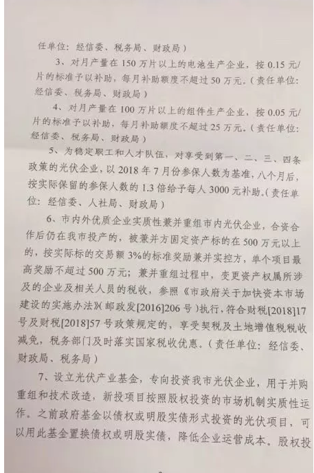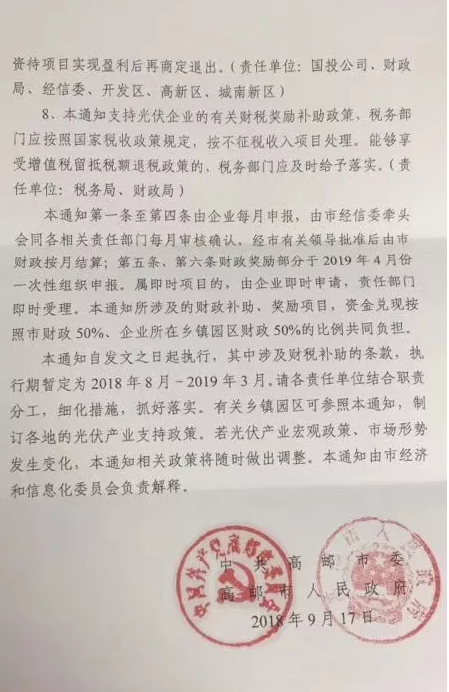 近日,中共高邮市委、高邮市人民政府发布了关于支持光伏产业平稳发展有关事项的通知,对多晶硅铸锭、单晶硅拉晶生产环节以及硅片、电池片、组件制造企业给予一定补助。