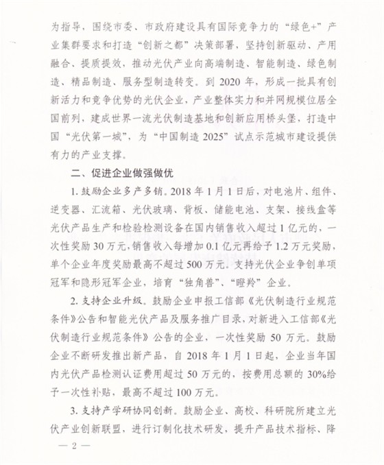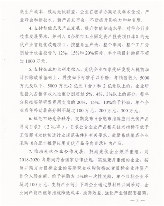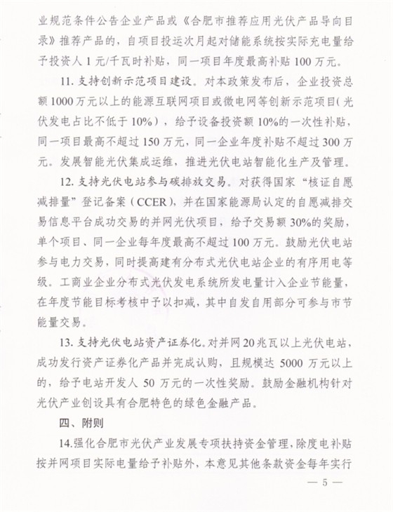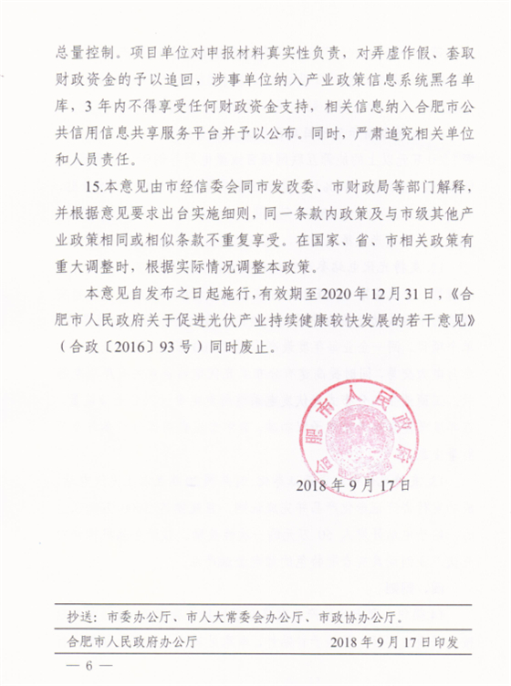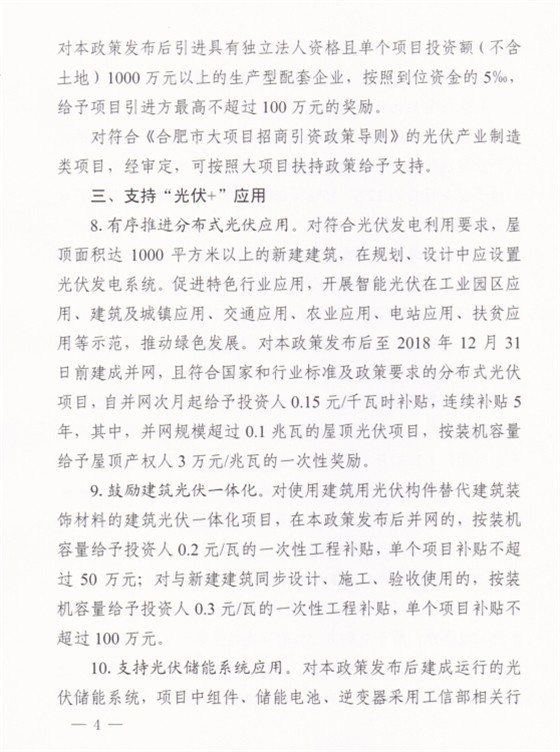 近日,安徽合肥正式印发《关于进一步促进光伏产业持续健康发展的意见》。对本政策发布后并网运行的光伏储能系统,项目中组件、储能电池、逆变器,采用工信部相关行业规范条件公告企业产品或《合肥市推荐应用光伏产品导向目录》推荐产品的,自项目并网次月起给予储能系统充电量1元/千瓦时补贴,同一项目年度最高补贴100万元。且企业投资金额1000万元以上的能源互联网或微电网创新示范项目(光伏发电占比不低于10%),给予设备投资额10%的一次性补贴,同一项目最高不超过150万元。详情如下: