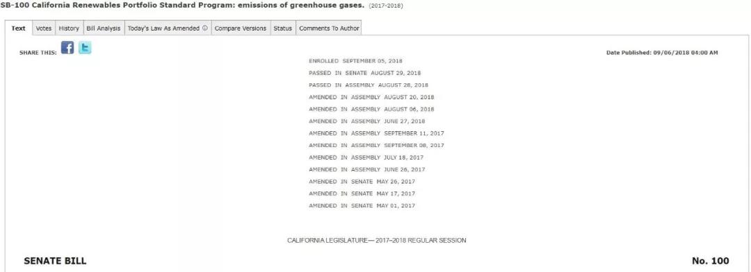 一项名为SB100的法案详述了以上目标,通过逐步增加电力系统终端中清洁能源供电的比重,摆脱加州电力对化石燃料的依赖,减少碳排放。该法案提出,到2045年12月31日,供加州终端消费者使用的零售电力和政府采购电力必须100%来自可再生能源和零碳能源。加州此前曾制定过一份“2030年50%清洁电力”的计划,SB100在此基础上进一步升级:2026年12月31日之前实现50%可再生能源供电目标,2030年12月31日之前将上述比例提高到60%。为了实现上述循序渐进的清洁供电目标,该法案规定了电力零售商和当地公共电力公司采购合格可再生能源电力产品的最低采购量。