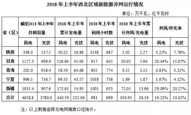 上半年,西北五省(区)新增光伏并网容量280万千瓦,累计并网容量3780.0万千瓦,占全网总装机的15.48%。光伏发电量235.06亿千瓦时,占全网总发电量的6.34%;平均利用小时数699小时,弃光电量26.19亿千瓦时,弃光率10.02%。西北五省(区)弃光率依次为:陕西7.78%、甘肃11.67%、青海3.21%、宁夏4.12%、新疆20.27%。