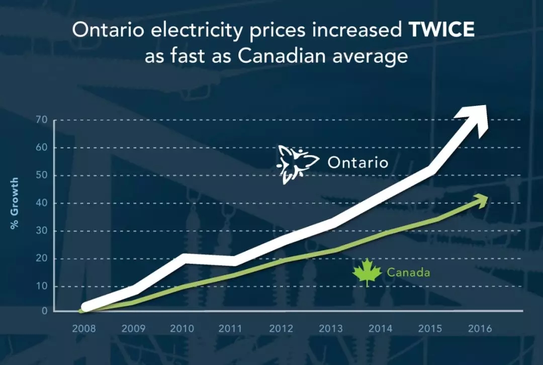据Fraser Institute提供的研究报告,2017年,安大略电力客户总共上缴了18.5亿美元的GA费用,仅安大略最大的两个城市多伦多和渥太华, 2010与2016年相比商业电费增长了50%,而其他加拿大城市平均增长14%。