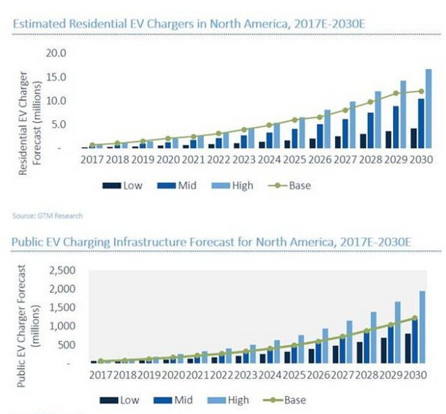 到2030年仅在北美将安装额外的1200万个住宅充电点。与此同时,在欧洲市场,将有900万个充电点安装在私人家庭中。而公共充电基础设施方面,GTM Research估计欧洲将安装160万个,而北美约为120万个。