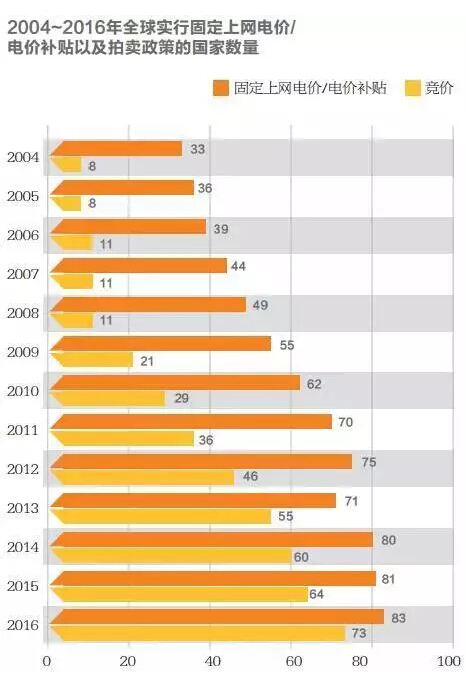 在所有的政策类型之中,采用固定电价(或上网电价补贴)与拍卖机制的国家数量最多,到2016年分别达到了83个和73个。