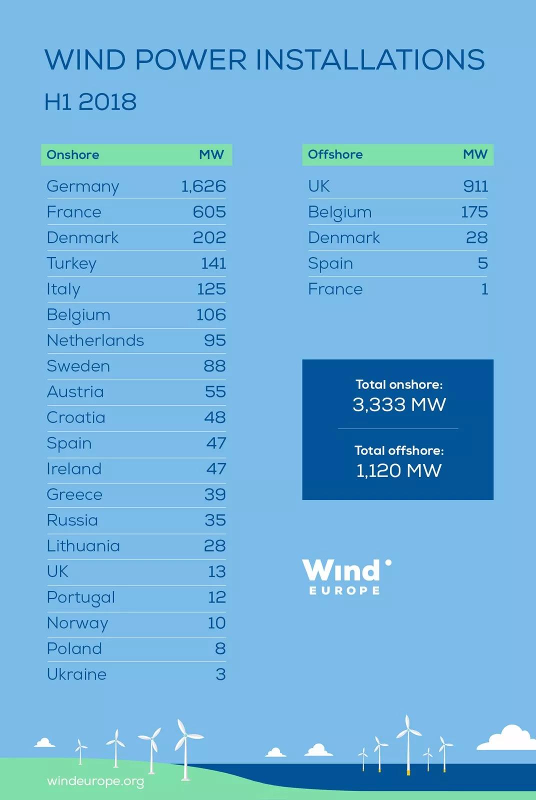 7月26日,WindEurope公布2018年上半年欧洲风电装机统计数据,上半年欧洲各国陆上及海上风电新增装机共计4.5GW,其中陆上新增装机3.3GW,海上新增装机1.1GW。去年同期新增装机数据为6.1GW,降幅高达26%!