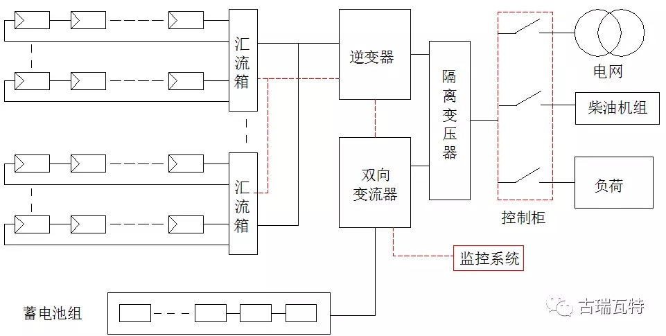 微网系统由太阳能电池方阵、并网逆变器、PCS双向变流器、智能切换开关、蓄电池组、发电机、负载等构成。光伏方阵在有光照的情况下将太阳能转换为电能,通过逆变器给负载供电,同时通过PCS双向变流器给蓄电池组充电;在无光照时,由蓄电池通过PCS双向变流器给负载供电。