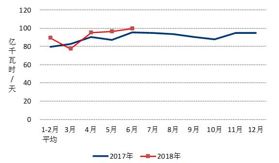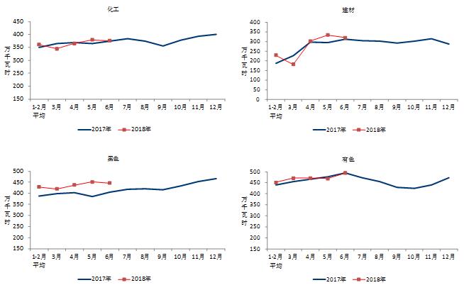 6月份,四大高载能行业用电量合计1636亿千瓦时,同比增长4.0%,占全社会用电量的比重为28.9%。其中,化工行业用电量376亿千瓦时,同比增长2.5%;建材行业用电量319亿千瓦时,同比增长3.6%;黑色金属行业用电量447亿千瓦时,同比增长10.4%;有色金属冶炼行业494亿千瓦时,同比增长0.2%。