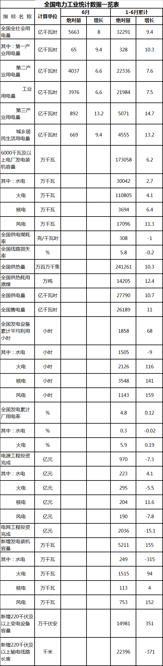 7月23日,国家能源局发布1-6月份全国电力工业统计数据。