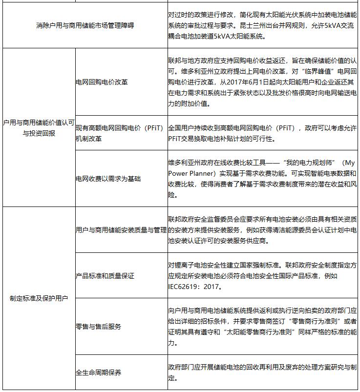 通过公开竞标召集和建设100MW储能项目。可再生能源技术基金提供7500万澳元拨款和7500万澳元贷款,支持光热、生物质、氢能和抽水蓄能项目建设。由于澳大利亚的储能市场以户用与商用储能为主,工业大规模储能相对发展落后,因此政府目前政策制定工作着力于在规范户用与商用储能市场发展方面,2017年澳大利亚清洁能源协会向联邦政府提出了13项政策建议,涉及创造公平竞争环境;消除户用与商用储能市场管理障碍;户用与商用储能价值认可与投资回报;建立标准及保护用户四个方面。