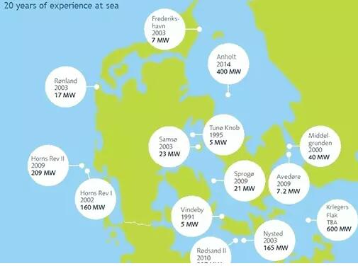 丹麦已投运、已批准或在建的海上风电场包括406.7MW的Horns Rev 3、650MW的Kriegers Flak,以及Vesterhav Syd和Vesterhav Nord近岸风场。