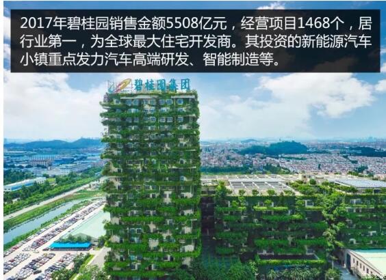 2017年9月,碧桂园深圳新能源汽车产业协会签署战略合作协议,双方计划以新一代汽车为核心,面向新能源、车载物联、智能汽车等前沿领域,为新能源汽车产业发展搭建大平台,促进科技产业和区域经济发展。2017年10月中旬,碧桂园斥资6.4亿元在广东佛山市顺德新城创智城片区买下总面积11.8万平方公尺的土地,计划在区内成立动力电池、新材料、整车、马达控制器、动力总成等5大研究院,打造新能源汽车小镇,建设园区、社区、街区三区融合的产品业态。顺德新能源汽车小镇产城总经理方兴勇接受媒体采访时表示,目前新能源汽车市场有比较大的供应和需求的差距,整车方面会谨慎关注,但在汽车产业核心零部件、软件测试、车辆运营服务等方面是发展重点。