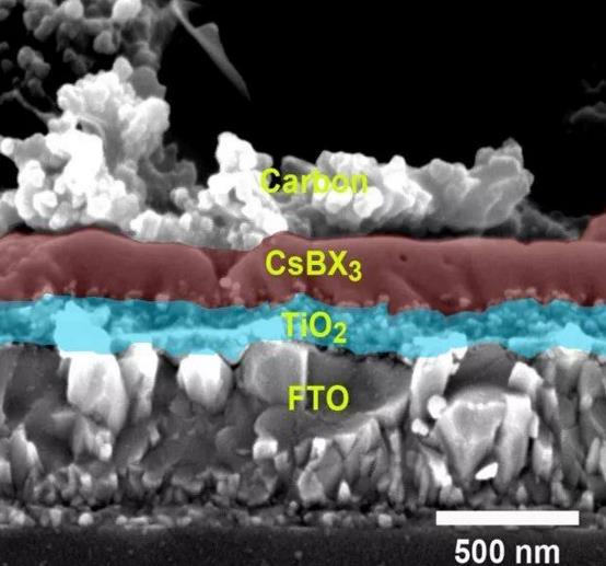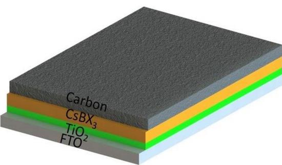 如下图所示,这种全无机钙钛矿太阳能电池具有几层。底层是仅有几毫米厚的玻璃,第二层是透明导电材料FTO,接下来是由二氧化钛组成的电子活性层,第四层是光敏钙钛矿,顶层是碳。