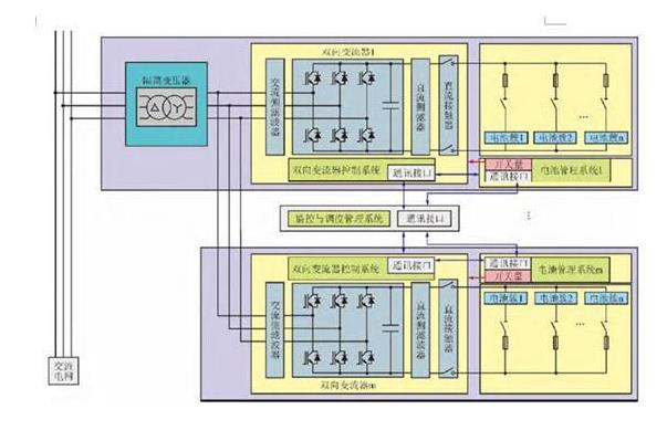 在储能系统中,储能电池在高压上只与储能变流器发生交互,变流器从交流电网取电,给电池组充电;或者电池组给变流器供电,电能通过变流器转换成交流发送到交流电网上去。