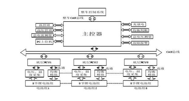 动力电池管理系统,只有一层集中式或者两分布式,基本不会出现三层的情况。小型车主要应用一层集中式电池管理系统。两层的分布式动力电池管理系统,如下图所示。