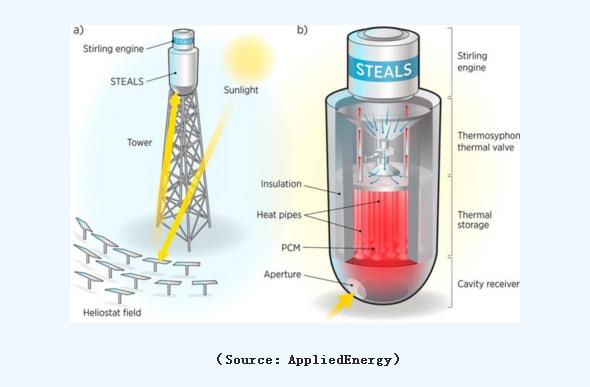 定日镜首先将阳光反射到STEALS底部的相变材料(PCM),而与PCM连接的钠热管会将热量输送到各个系统中,热管顶部也会与热虹吸管的蒸发器连接。其中液态钠蒸发后会输送到史特林发动机中,并在发动机上方凝结,之后液态钠会再回流至蒸发器。为调节电力输出,调整阀门开关可控制钠流量与从储热器到动力区块的热量。
