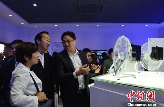 图为参观者在观看用石墨烯OPV供电的电器。 郝学娟 摄