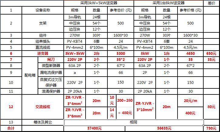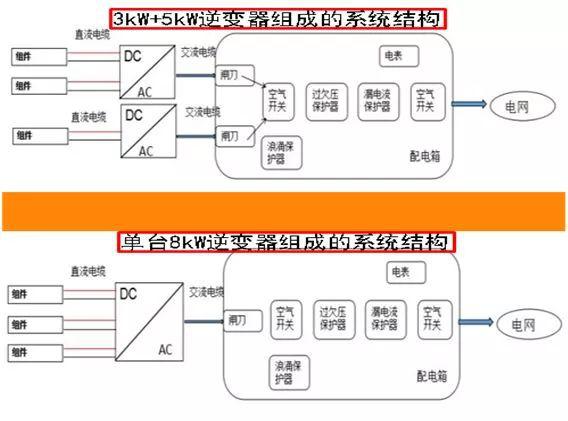 首先以5kW+3kW逆变器设计的光伏系统和单台8kW逆变器设计的光伏系统进行对比