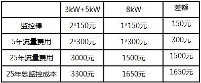 >>>>在监控成本上,单台8kW逆变器使用一个监控棒,一份流量套餐。因此整体监控成本是使用3kW+5kW逆变器的一半。总之,单台8kW逆变器的建造成本至少节省750元,25年总监控成本要节省1650元。