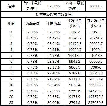 装机容量9kW,PR=80%,浙江地区的光照按照全年每天3.6小时计算,(参照——全国各省峰值日照时数),全年发电估计时间为1326小时,预估该项目首年发电量10512度。首年衰减为2.5%,25年末最低功率为80%。