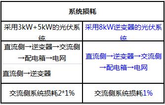 如上图两种配置系统结构,两者直流端接线相同,交流侧3kW+5kW逆变器比单台8kW逆变器多一路交流配线。若交流侧按照1%的损耗来计算,则系统损耗情况如下表所示