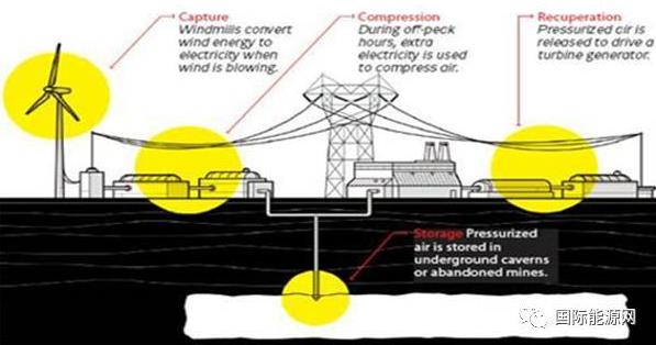 压缩空气储能采用空气作为能量的载体,大型的压缩空气储能利用过剩电力将空气压缩并储存在一个地下的结构(如地下洞穴),当需要时再将压缩空气与天然气混合,燃烧膨胀以推动燃气轮机发电。