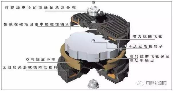 在一个飞轮储能系统中,电能用于将一个放在真空外壳内的转子即一个大质量的由固体材料制成的圆柱体加速(达几万转/分钟),从而将电能以动能形式储存起来(利用大转轮所储存的惯性能量)。