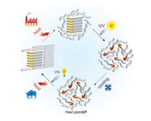 AzoPMA暴露在阳光下,它的分子会“呈”高能“态”。受到另外的触发稍微加热或被激活,这种分子就回到低能“态”,储存的热量就会“喷涌”出来。
