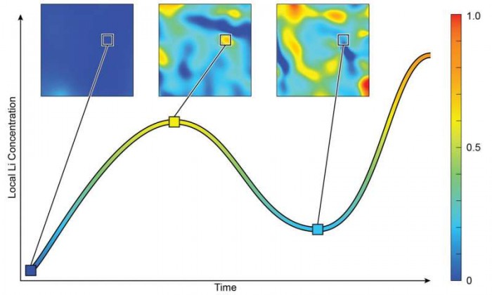 “与海绵吸水类似,我们看到纳米粒子里锂离子的总浓度在不断增加,”主持该研究的布鲁克黑文国家实验室可持续能源技术部科学家王冯说,“但与水不同,锂离子会选择性地从某些区域流出,这造成晶格间锂离子浓度不一致。”