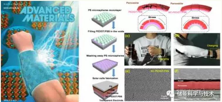 在上述研究的基础上,研究人员发现柔性钙钛矿器件中的界面层对钙钛矿层的生长和稳定性具有较大影响。研究通过纳米组装-印刷方式制备的蜂巢状纳米支架可作为力学缓冲层和光学谐振腔,从而大幅提高柔性钙钛矿太阳能电池的光电转换效率和力学稳定性。研究表明,蜂巢状纳米结构可以有效释放器件弯折时产生的应力,并作为支架诱导钙钛矿薄膜结晶。同时,该结构作为光学谐振腔可对整个器件进行光富集调控,从而提高器件的光吸收效率。引入蜂巢状纳米支架后,所制备的柔性钙钛矿太阳能电池光电转换效率达12.32%。进一步研究发现,该电池具备优异的耐弯折性,可应用于柔性太阳能电池组件。该太阳能电池组件光电转换效率高、性能稳定,可广泛应用于各类可穿戴器件。研究为研发新一代可穿戴电子设备提供了新的思路和方法,研究成果发表在Advanced Materials杂志上。