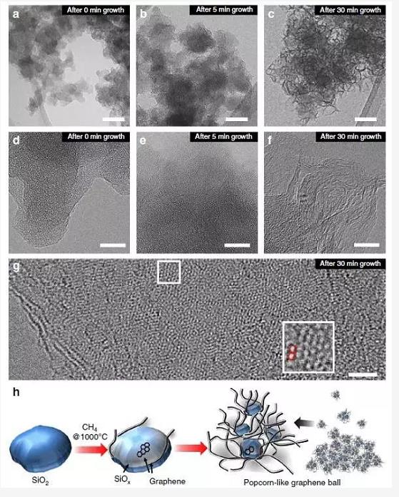 g) 30min生长的石墨烯以及原子能级的放大图;