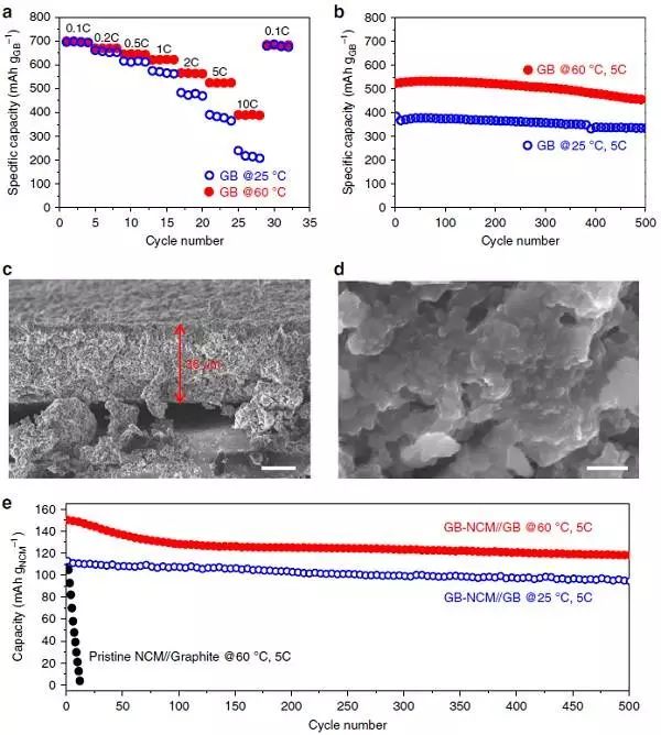 e) 石墨烯球-NCM/石墨烯球全电池在5C下25/60℃的长循环特性。
