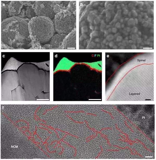 e) 石墨烯球-NCM表面的高倍STEM图;