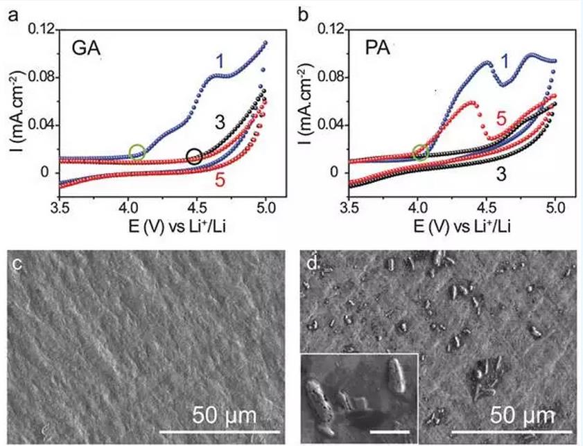 (d) LMO/PA 和LMO/GA电池的充放电曲线,实线和圆圈分别是LMO/PA 和LMO/GA电池;