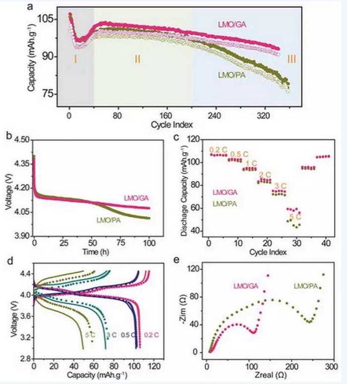 (e) LMO/PA 和LMO/GA电池的电化学阻抗分析。