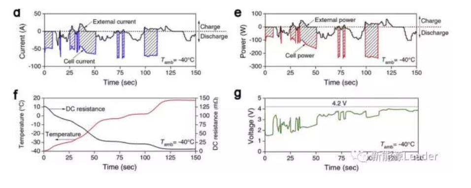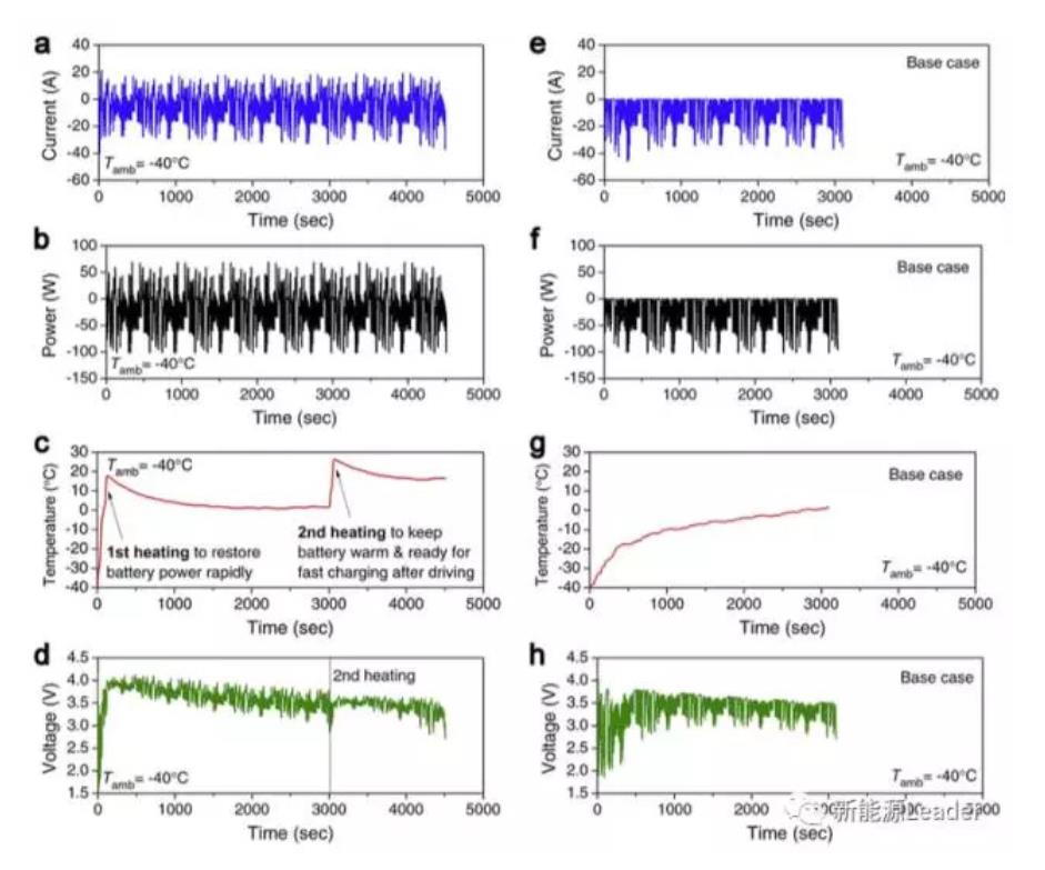 下图为使用自加热电池和使用普通电池的对照组在-40℃下使用过程中的电流、功率、电池温度和电池电压等数据曲线,其中左边为采用自加热电池的实验组,右边为空白对照组。从电池温度上看(图c实验组,图g对照组),自加热电池的温度升高速度要远远快于对照组,实验组紧紧用了112s就恢复到了20℃,并且实现了全部的刹车能量的回收,而对照组电池用了3000s,温度才恢复到了0℃,从而导致无法回收刹车能量。