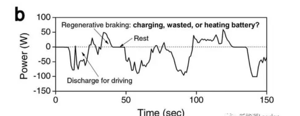 我们知道在电动汽车的使用过程中,除了正常行驶外,还会发生刹车等情况,电动汽车在刹车等过程中一般都会进行能量回收,在锂离子电池温度足够的时候,这部分能量会直接存储在锂离子电池中,但是当锂离子电池温度过低时,为了防止锂离子电池在低温下充电造成负极表面析锂,这部分能量通常被浪费掉。Guangsheng Zhang利用自加热电池快速自加热的特性,设计了低温下的制动能量回收管理程序,在电池温度较低时,回收能量会首先用于加热电池,当电池温度加热到合适温度后,然后会将回收的能量存储到电池。