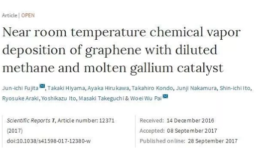 众所周知,CVD法是目前制备高质量单层大面积石墨烯薄膜最有效的方法,但是目前的工艺需要1000℃以上的高温,成本较高,过程复杂。近日,来自日本和台湾的研究人员团队创建了一种新的CVD方法,使用稀甲烷蒸气源和熔融镓催化剂在低至50°C的温度下生长石墨烯。研究结果发表在了近期《Nature》旗下的《Scientificreports》期刊上。