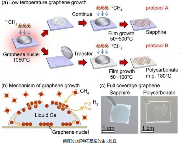 这种新方法可以打破这种局限,该团队选用熔融镓作为催化剂在稀释甲烷气氛的帮助下在蓝宝石和聚碳酸酯基板上生长CVD石墨烯,所需温度可以降低到50℃左右。选择镓作为催化剂,因为它是近来石墨烯生长方法中被证明有效的催化剂,并且在合成石墨烯之后可以通过气体射流容易地除去。碳源是利用空气与氮气和氩气混合物混合稀释至5%的甲烷气体。