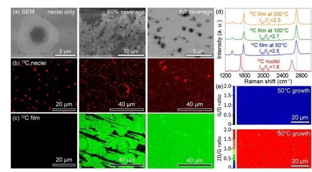 研究人员使用拉曼光谱、扫描电子显微镜和高分辨率透射电子显微镜检查了生长的石墨烯的质量。表征结果显示,新的CVD工艺能够在近室温(相对来说)下生长出高质量的石墨烯,石墨烯分别在50℃和100℃的生长在了聚碳酸酯基板和蓝宝石衬底上。