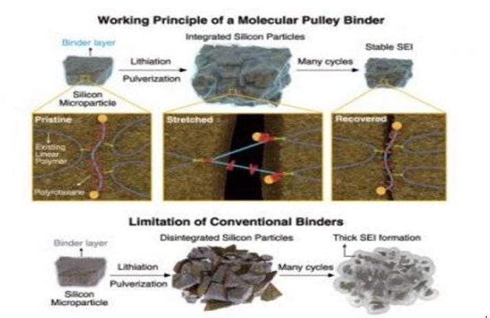 由Jang Wook Choi教授和Ali Coskun教授领衔的KAIST研究小组于7月20日报道了一种用于硅阳极锂离子大容量电池的分子滑轮粘合剂。