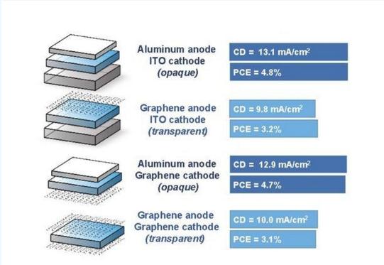 石墨烯是一种优秀的导体材料,在片材中也只有一个原子的厚度,几乎达到透明,它可以用来制造很薄的器件。不过制造具有石墨烯的透明太阳能电池板还是有一定的难度的:即把两个电极粘在一起并与基板结合,用以确保电子仅从一个石墨烯层流出。