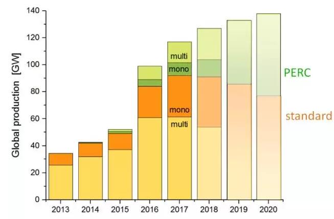 2006年用于对P型PERC电池的背面的钝化的AlOx介质膜的钝化作用引起大家重视,使得PERC电池的产业化成为可能。随后随着沉积AlOx产业化制备技术和设备的成熟,加上激光技术的引入,PERC技术开始逐步走向产业化。2013年前后,开始有厂家导入PERC电池生产线,近几年PERC电池越来越引起行业重视,产能获得快速扩张。2017年全球预计新增产能6.5GW,从现有标准电池线升级2.5GW,预计至2017年底,全球PERC电池产能将达到20GW。