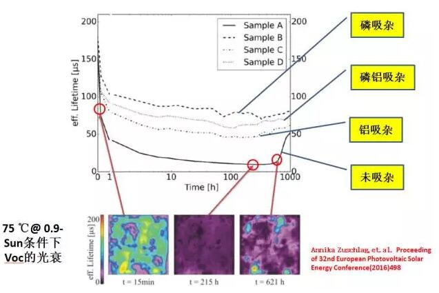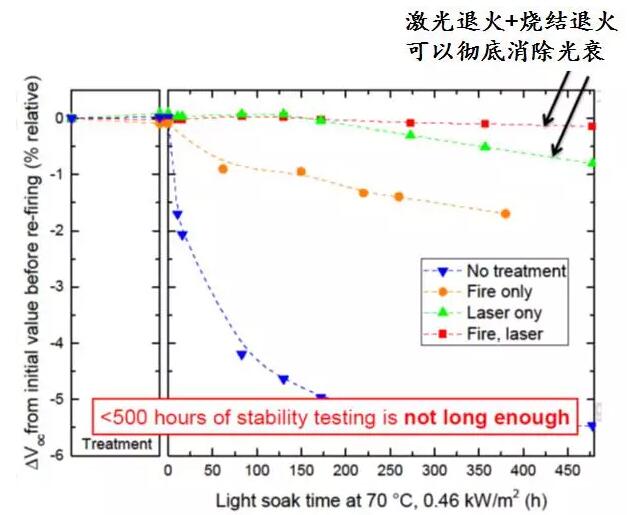总体来说:单晶PERC电池的衰减高于单晶常规电池,其原因主要是由于B-O对导致的,目前已经通过光照退火成功抑制。多晶PERC电池的衰减表现的与温度相关,其原因仍不明朗,但是似乎与多晶硅中过多的金属离子有关。目前已经找到抑制LeTID的途径,包括高温、高光强辐照,以及电注入等技术工艺。但是其大规模应用还具有挑战性。PERC电池对硅片质量提出了更高的要求,多晶硅在这种电池中目前处于劣势状态。