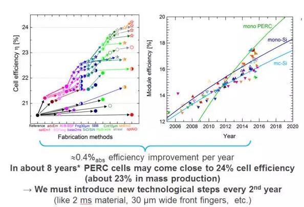 PERC电池还有很大的效率提升空间。今后发射极、背面铝背场、主栅、硅片质量等还有优化空间。预计即使没有重要的突破性技术,2025年左右,单晶PERC电池可实现高达24%的转换效率,产线达到23%,意味着从现在到2025年,每年将有0.4%左右个绝对值的效率提升,同时随着PERC电池产业规模的扩大和技术优化,预计至2025年成本也将降低至目前的一半。