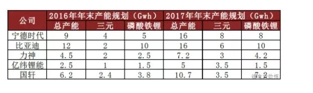 另外从几家动力电池2017年的产能规划可以看出,对于三元锂电池的产能扩张也尤其明显,就连比亚迪这样过往一根筋钟爱磷酸铁锂电池的企业,在2017年都维持磷酸铁锂产能不变,转头扩张三元锂电池。
