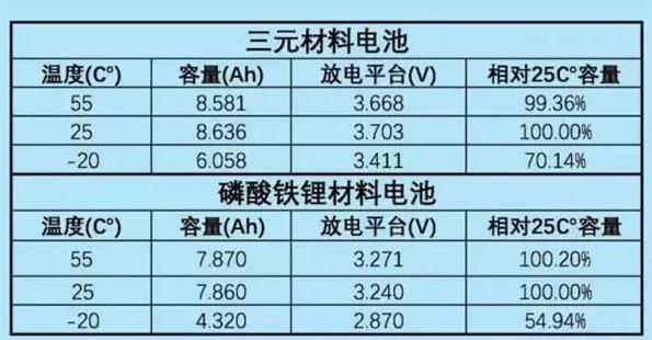 从上图中能够看出,以25℃为基准常温,两类电池在55℃高温下放电与常温25℃下放电,放电容量几乎没有差别。但在零下20℃时,三元锂电池与磷酸铁锂电池相比有比较明显的优势。