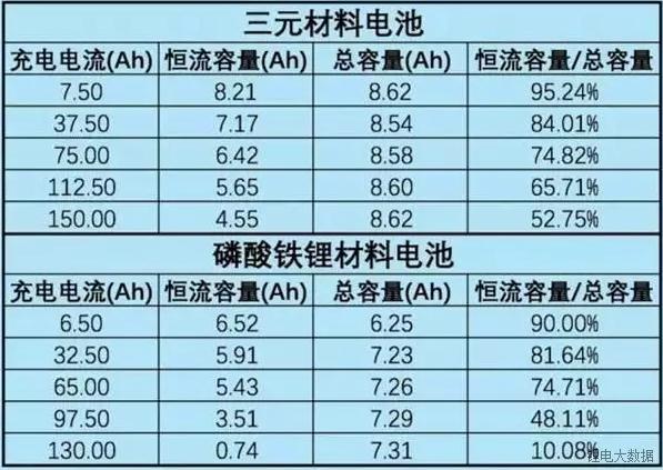 从表中可以看出,三元锂电池与磷酸铁锂电池在10C以下充电时,恒流比无明显差距,10C以上倍率充电时,磷酸铁锂电池恒流比例迅速降低,充电效率迅速降低。
