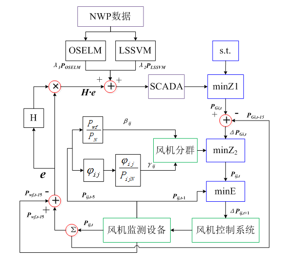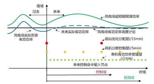 目前风电场内的风机有功调度策略存在两方面问题:⑴缺乏对风电场有功功率状态、风机状态与可调节能力、调度计划指标和调度波动次数等问题的综合考虑;⑵在结合多种预测时间尺度的风电场在线优化控制能力方面受限。