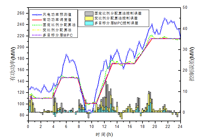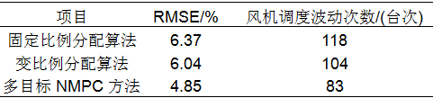 多目标分层递阶MPC方法明显优于传统的固定比例分配算法和变比例分配算法,对比结果如图4和表2所示,其中固定比例分配算法和变比例分配算法均根据15min前风电场有功功率和风电场有功调度计划指标进行有功功率分配,滚动计算周期为每15min一次。