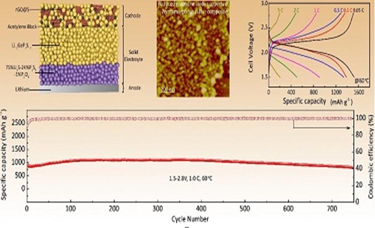 尽管全固态锂硫可以解决目前传统锂硫电池面临的问题,然而其带来了新的挑战,如固-固界面问题以及应力/应变等效应导致的电池容量衰减等问题,是影响全固态锂硫电池循环寿命的关键。近日,中国科学院宁波材料与工程研究所固态锂电池团队研究员姚霞银领导的小组与美国马里兰大学合作,设计了一种新型硫正极结构的全固态锂硫电池,通过在还原氧化石墨烯上沉积超薄(~2nm)非晶态纳米硫层保持复合材料的高的电子传导率,进而将还原氧化石墨烯/硫复合材料均匀分散在超锂离子导体Li10GeP2S12基复合材料中,从而实现高离子电导率和低的应力/应变。以上述还原氧化石墨烯/硫复合材料-Li10GeP2S12-乙炔黑混合物作为正极层,Li10GeP2S12/改性Li3PS4双层电解质作为固态电解质层,金属锂为负极组装全固态锂硫电池,其充放电曲线与传统锂硫电池截然不同,只有一对充放电平台,显著抑制了多硫化物的产生。