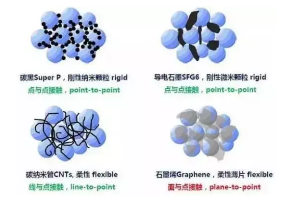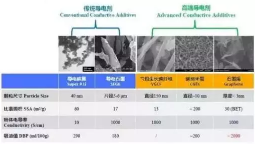 作为锂离子电池导电剂材料使用的主要有常规导电剂SUPER-P、KS-6、导电石墨、碳纳米管、石墨烯、碳纤维VGCF等,这些导电剂拥有各自的优劣势。具体来看: